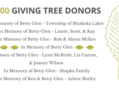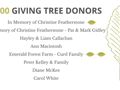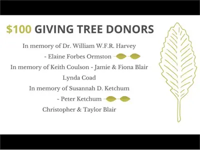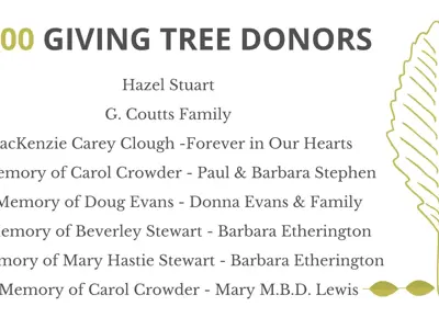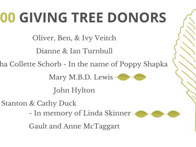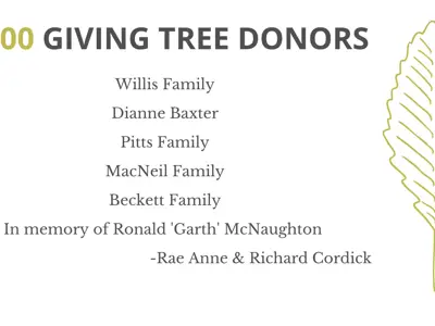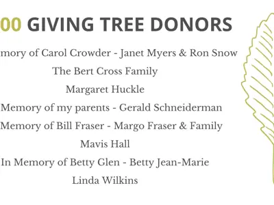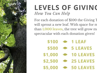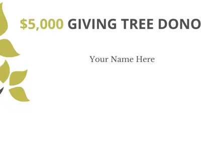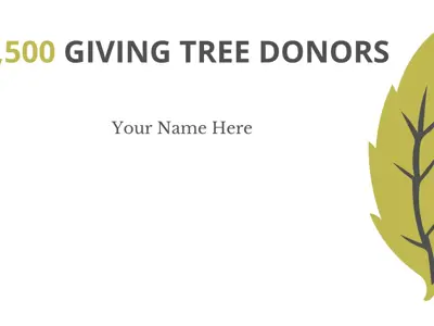 Your donation of $100 adds a beautiful metal leaf to The Giving Tree. In recognition of your donation, your name or memorial message displays on the digital board at levels of $100, $500, $1000, $2500, or $5000.