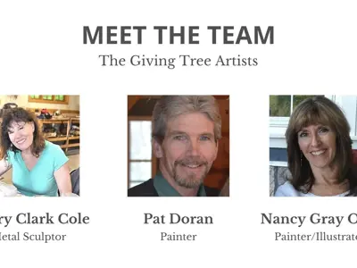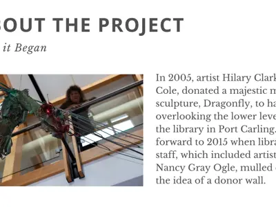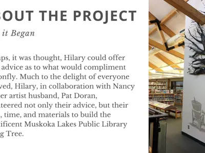 The Giving Tree is collaborative metal and paint art installation at the Port Carling branch by artists Hilary Clark Cole, Nancy Gray Ogle, and Pat Doran.