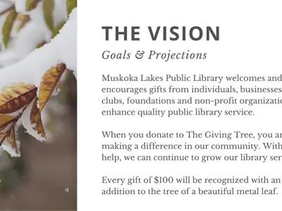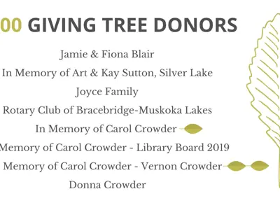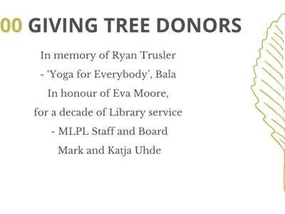 Thank you for donating to the library using Canada Helps. Your donation will go to support library collections, programs, and enhancements for both branches of MLPL. The success of the Muskoka Lakes Public Library is rooted in the generosity and commitment of our Community Partners. Your support provides the strength, vitality, and sustainability, which enhances the availability of diverse library resources, and programs. Your donation will enable the Library to continue to offer high quality programs and services to meet the needs of our growing community. Muskoka Lakes Public Library thanks and appreciates the generosity of all our donors.