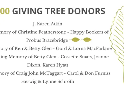 The Friends of the Library are a group dedicated to promoting, supporting and improving the services and facilities of our libraries in Bala and Port Carling. Our Annual Silent Action runs for one month and has been a great success for the last many years. In Port Carling, a new wheelchair accessible circulation desk was installed in 2019 and a water bottle refill station was installed in 2021. In Bala, a beautiful patio and reading corner was built. Also in 2021 the Friends purchased a new laminator to create a book and art installation called Story Trails along the walking paths in Hanna Park in Port Carling and Muskoka Lakes Sports Park in Bala. This is a delightful way for children and adults to enjoy reading and the outdoors, at the same time. Outdoor sitting areas in both library locations have been purchased by the Friends.